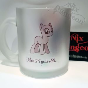 Our frosted glass mugs are a standard size 11 oz mug and can be printed with almost anything your heart desires!