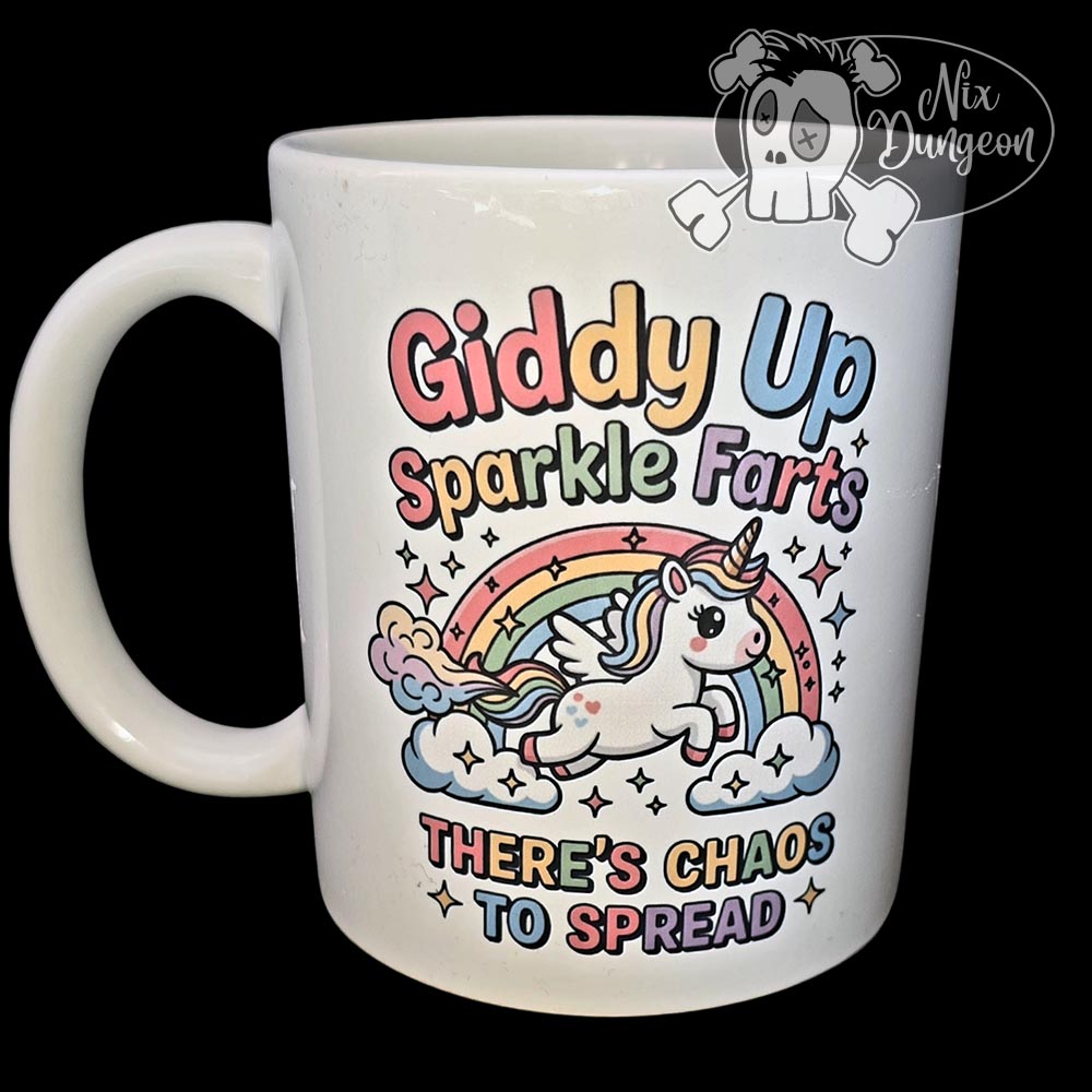 Mug reads: “Giddy up Sparkle Farts, there’s chaos to spread”