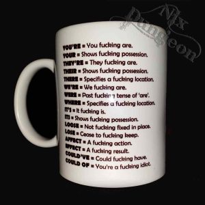 Get one up on the Grammar Police and get your grammar fucking sorted once and for all! Get yourself or the anally retentive one in your life the Grammar mug now from Nix Dungeon.